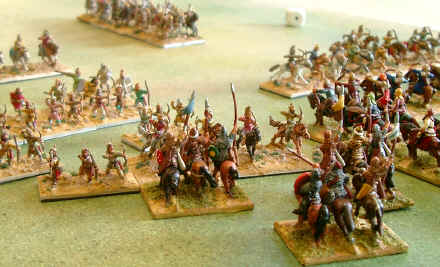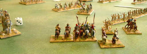 For some inexplicable reason I'd been expecting to see a European Skythian deployment, with allied hoplites - but instead they turned out to be bow-maniac Massegatae, and they were attacking. Never having defended with this army, I had also deployed as if I was attacking (doh!), and had expected my cataphracts to be riding down hoplites butted up against the RGo on my left, and my Kn (F) be be engaged in a swirling melee against lesser numbers of Kn (F) on my right, supported by my all LH command.
