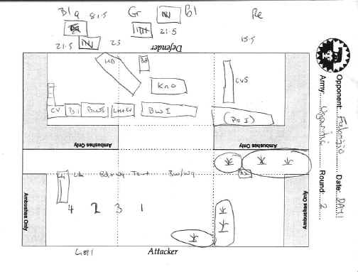 The game starts well, with virtually all the (rough) terrain falling on my side of the table, The Ugarits deployed in classic fashion, with columns of their capital troops ready to break from the back and re-deploy to positions of danger, with a flurry of clever breakthrough (Kn(O) through Bw (I)) and column expansion moves. Much of what I considered as padding formed a wall of crap to help fill the table and also to lure me in.
