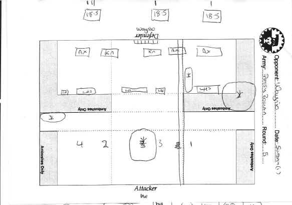 With a flurry of poor pips the Liths were unable to capitalize on this position to claw back a command - a 4-6 defeat, leaving Waynio to play Simon Hall on the top table in Round 6 and me on Table 2 .....