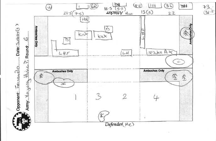 This time for lunch we stuck with the red wine, topped up with a beer (it was a bit hot) but sat al fresco and I had some excellent mushroom ravioli with a cream sauce. The rather fabulously painted Spanish Hsien-Pi awaited me in Round 6. Almost expecting DBE knights, I was tempted to take my 2nd list with artillery, but thought better of it - correctly, as the Hsien Pi had only Kn (X) as it turned out.