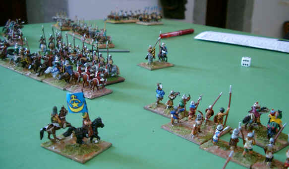 Desperate for extra distance, a Wagon projected itself forwards from the line to use up an odd extra pip, offering the Khurasanians a shot with an early 2-2 with 3 Lh (F) to kill a vital wagon - and the Lh F obliged. However once committed this close to the Lithuanian lines they could not be extracted, and one of the key Khurasanian commands was soon 3 elements down before its capital troops were committed.