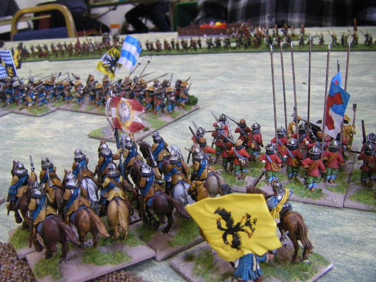 Suddenly the two lines of troops closed up, apart from one unit facing the Kurassiers. Either a new rule had been invented allowing them to incline backwards, or the potentially Early Russians had moved up, perhaps even to get into Arquebus range ?
