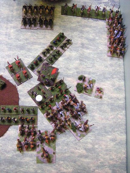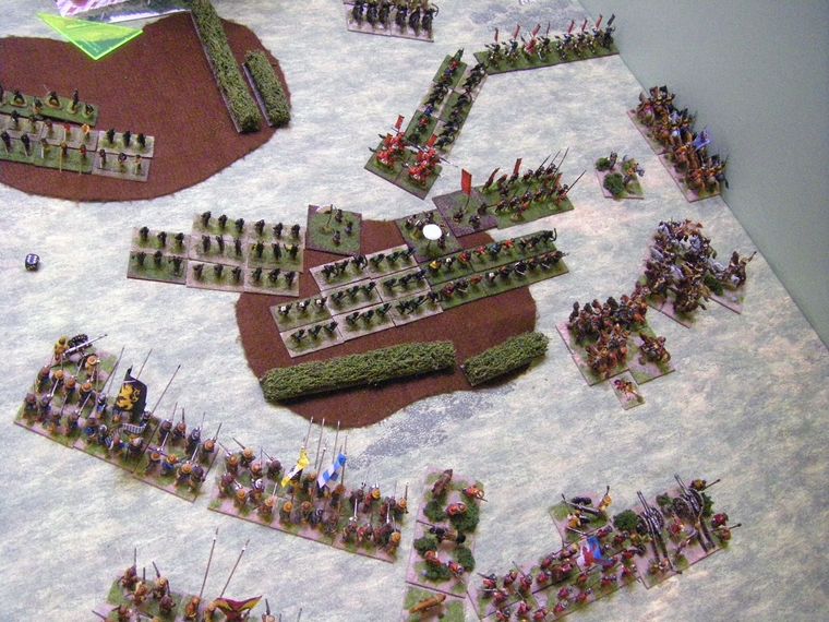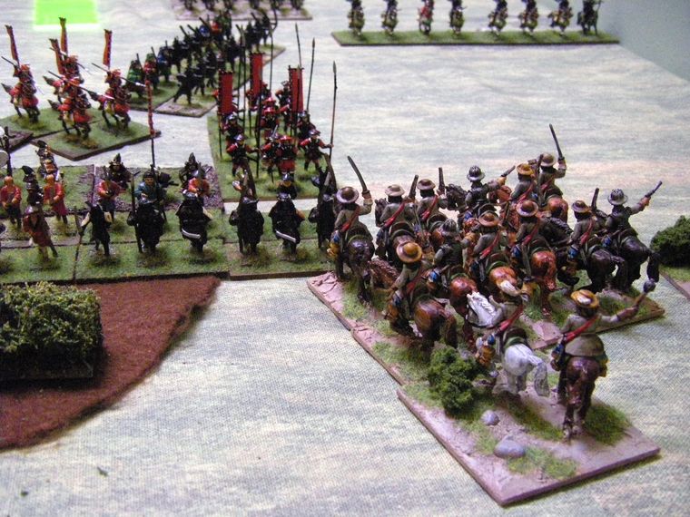 As the German dragoons wisely got out of the way, the two lines closed. At the top two units of Horse have turned to threaten the Samurai advance guard, and the 2 bases of Commanded Shotte are also joining in. The third unit of Horse is starting to look exposed as it pushes forwards relentlessle (or recklessly), whilst the many shooting units are yet to really make their mark on the enemy