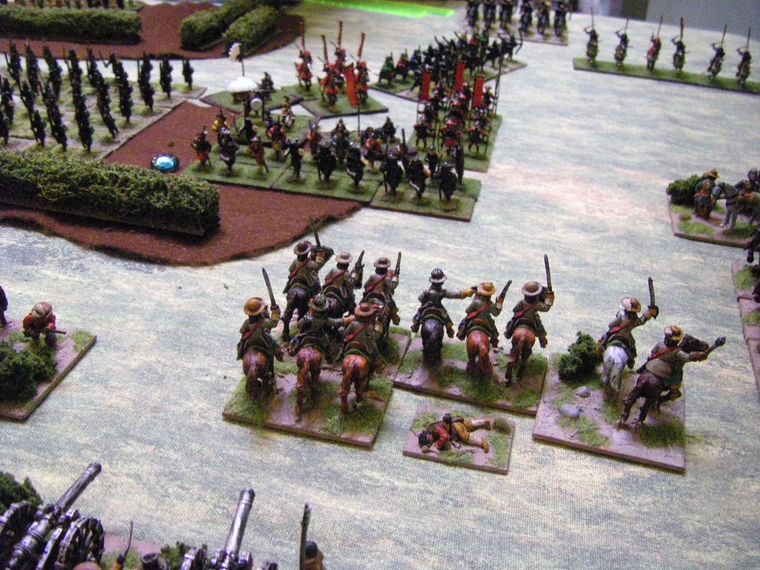 The Samurai started to come under a hail of shotte from all sides, as the German Horse continued to hack away at the exposed infantrymen, and the rest of the German mounted wing advanced unopposed in the distance