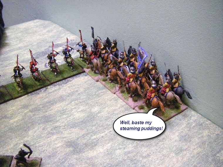 As the Dragoons pinned back the advancing Samurai, the German artillery park barked out ineffectually - and a tidal wave of Horsemen created what looked very much like a threatening flanking maneuver, with only some cheapskate 2-to-a-base Samurai Cavalry to halt their headlong rush into the endzone