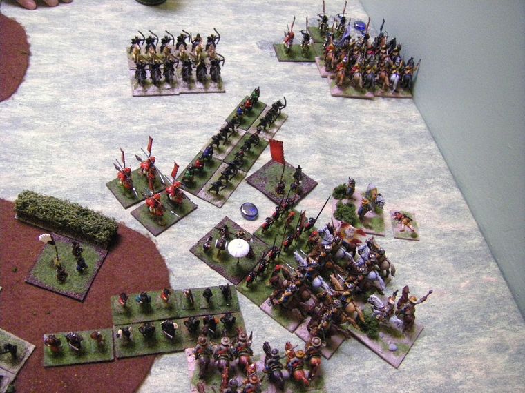 Well, they were until the Samurai wheel a bit. Everyone charges in, with mixed success. The best result comes as the column of Kurassiers catches the evading Samurai cavalry, which surely spells the end of them. In the middle the Samurai Guard have lost a base and gone DISR - a disaster for such a high morale (and small base strength) unit. And the third unit has again failed to achieve much with it's own charge. But pretty much all the Samurai generals are now in this one spot - creating weaknesses elsewhere no doubt?