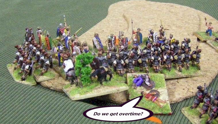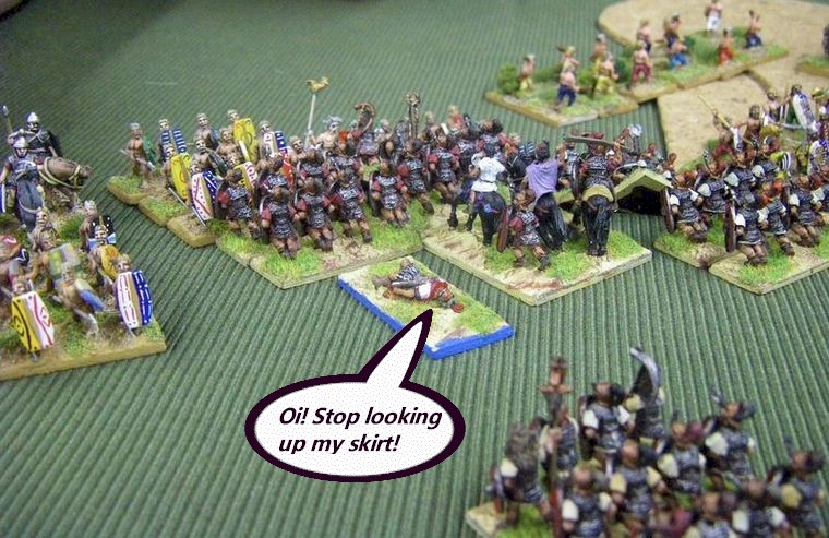 And what the hell happened here? You got turned over by Gauls? You are two factors up in melee against most of them, yet you failed to win? Admittedly your opponent widely took an army with not that many of the typical Gallic warrior, and used the terrain you set down to cut your army in half and place lots of his men totally out of harms way, but even so.