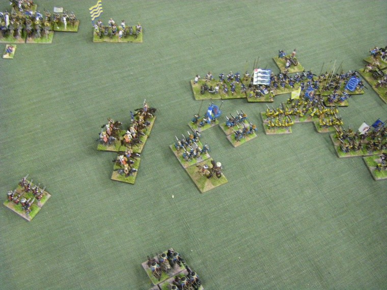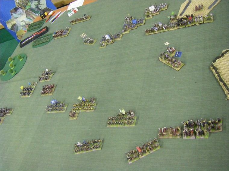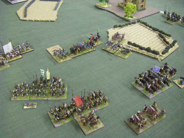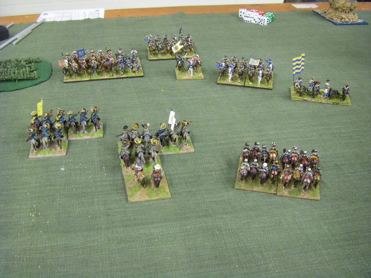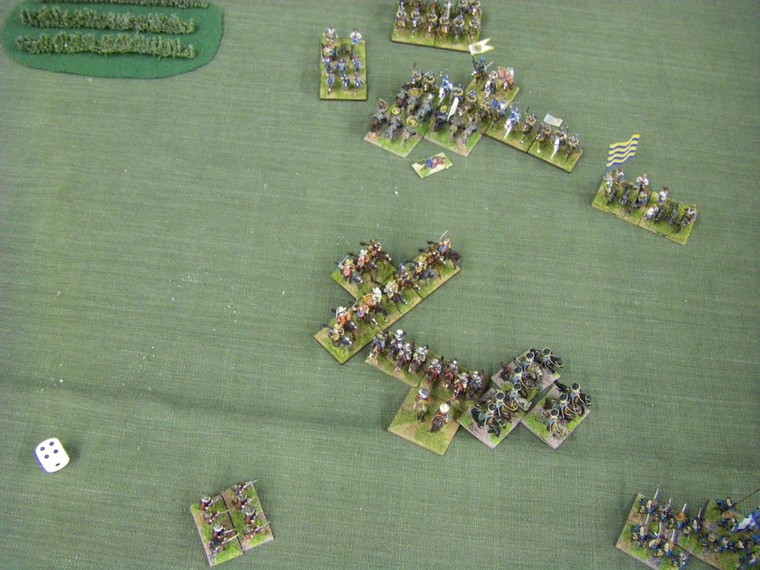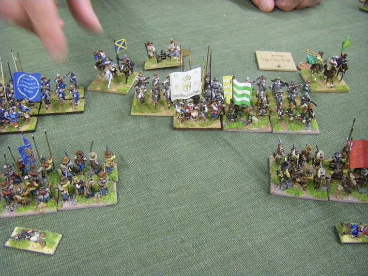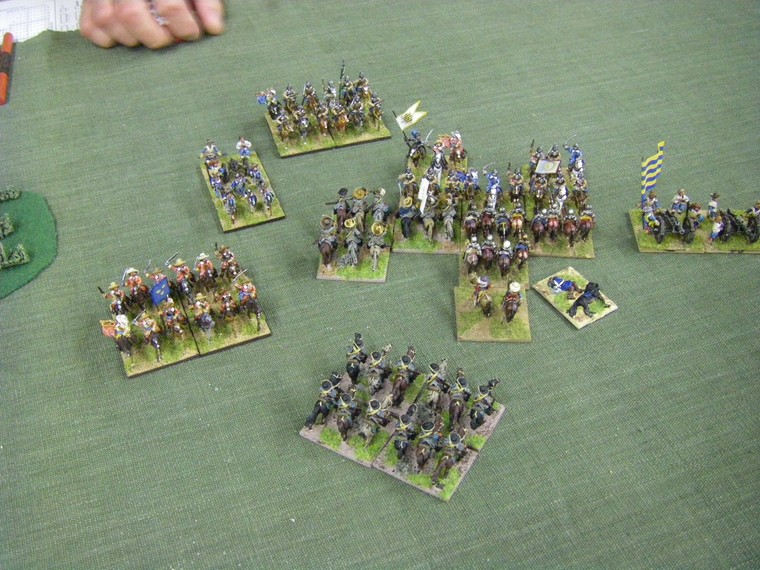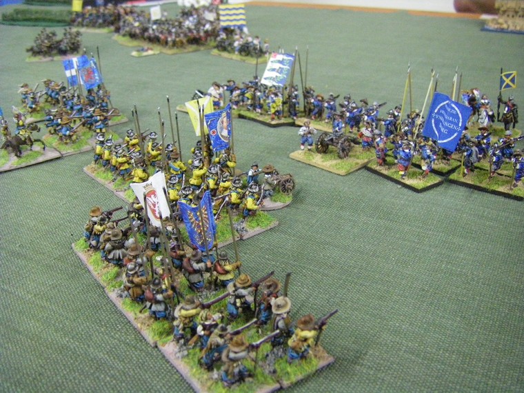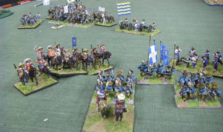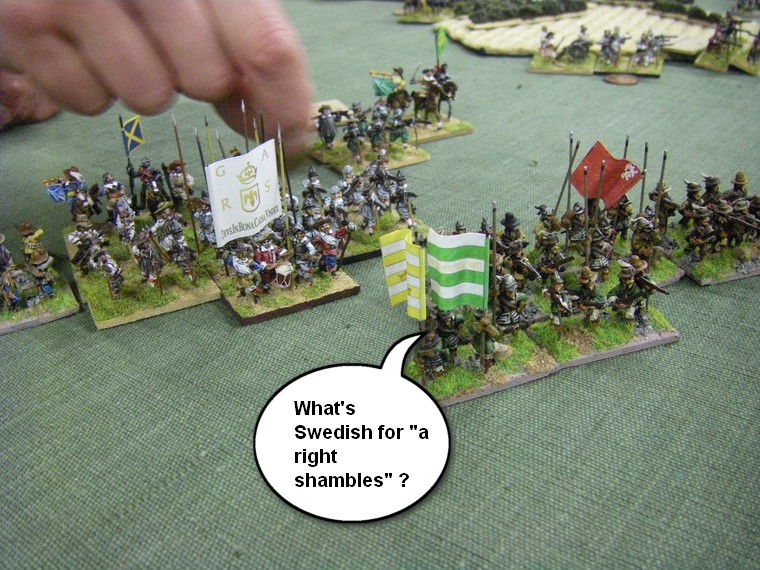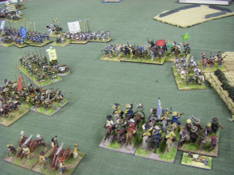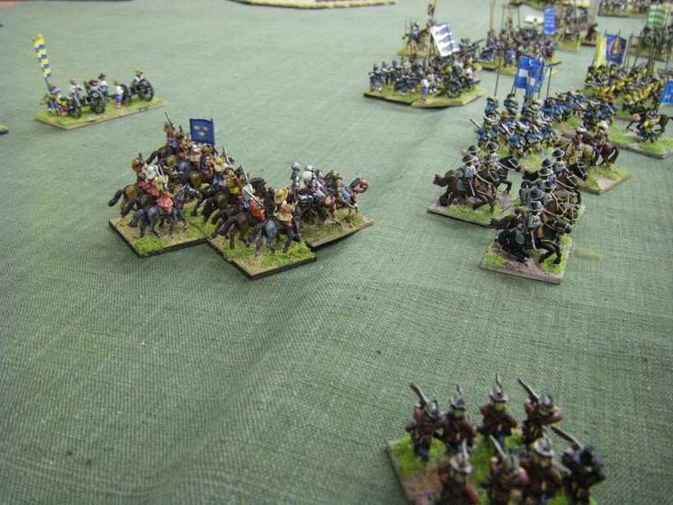 lmost immediately the game is moving towards a decisive clash all along the line. The irritant is that up at the top one unit of my horse has suffered a base loss and a cohesion drop to the shooting of the commanded shotte pairing, but surely there will be enough horse left to overrun the two solitary units they face ... oh - that's another Enemy Swedish unit frantically redeploying. Maybe 4 against 3 is fairer odds - but still in my favour ?