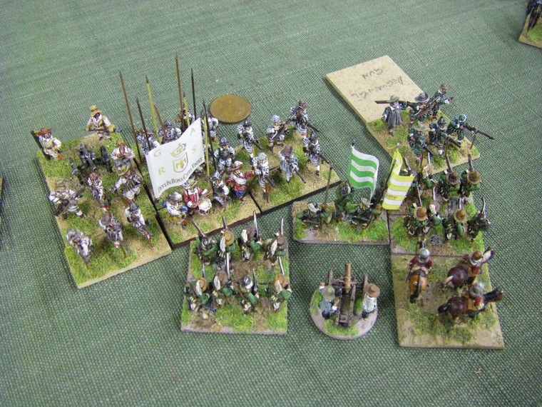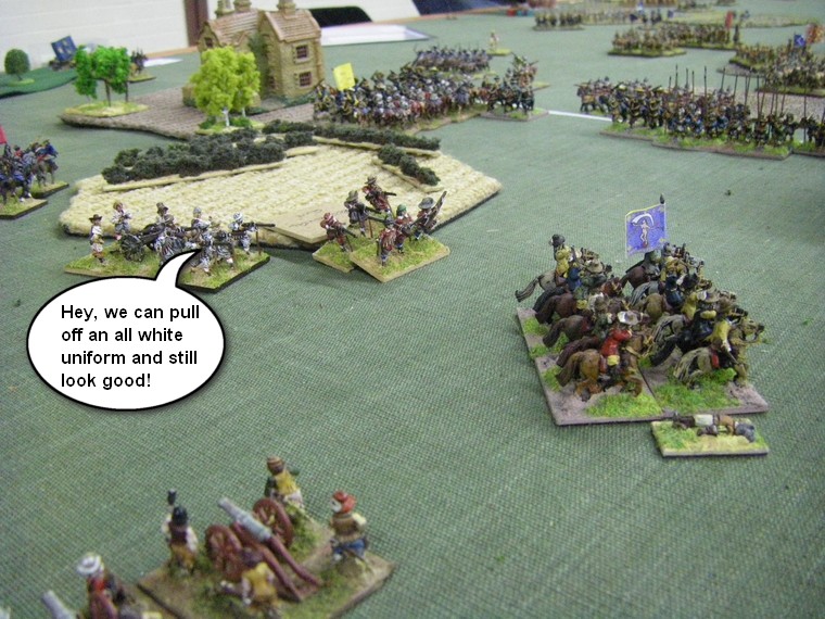 Elsewhere German mercenaries are pouring fire into the advancing Enemy formation, aided by our Gunnnes. One decent hit and a unit of 2 commanded shotte will surely explode, leaving the Enemy Geman Cuirassiers exposed?