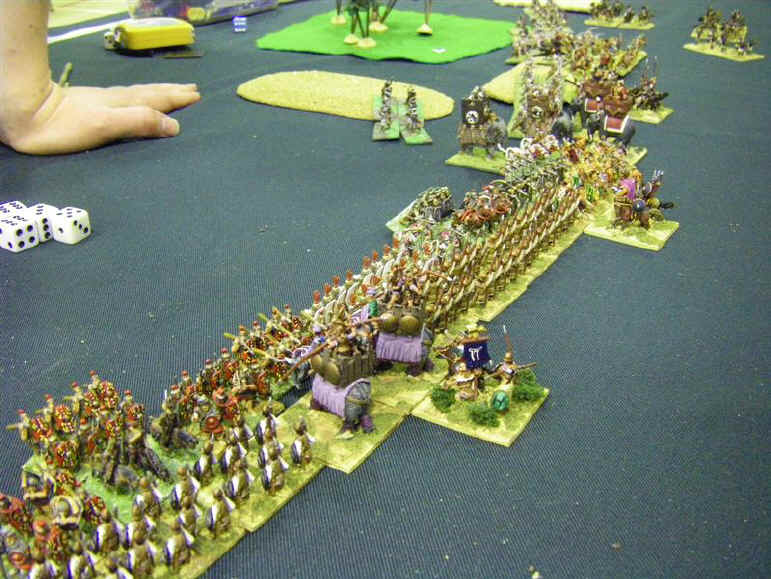 The whole battle line clashed - nearly 4 feet of combat with 7 or 8 units engaged on each side. I knoew my spearmen would be looking to try and hold on in the middle, but I could accept their demise as long as it was slow and I won on the flanks. And looking along the line I did appear to have the slight curve in my favour - it might be Cannae yet !!!