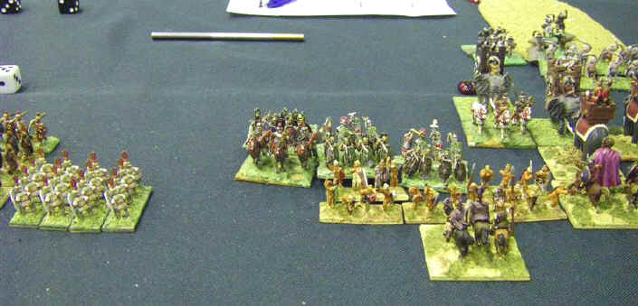 In the middle the Romans had surprisingly few legionaries - 2 blocks of 8, and 4 Triarii - but they had a whole load of Gauls, some more rubbish skirmishers, and 2 elephants - so it was going to be alot more even in the RGo that I had hoped.