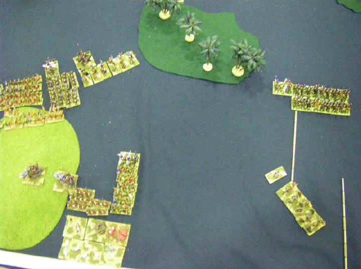 With the terrain falling irritatingly in the middle of the table (rather a reverse of the last game) I decided to try out the tactics I'd just witnessed, and concentrate my forces in a relatively secure part of the field - away from where I guessed (correctly) that the rather scary pikes would be deployed. I could then swing round and overwhelm the rest of the army with my superior numbers of skirmishers and superior quality of medium foot, whilst hopefully avoiding the pikemen entirely.