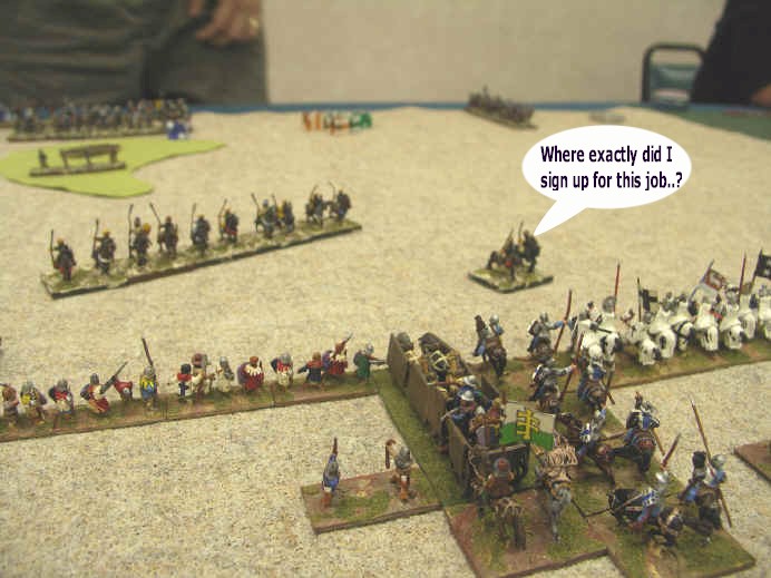 My heavy-hitting right wing moved imperiously forwards, as Dan attempted to redeploy his bowmen (and X-bowmen) to face my knights in the center.