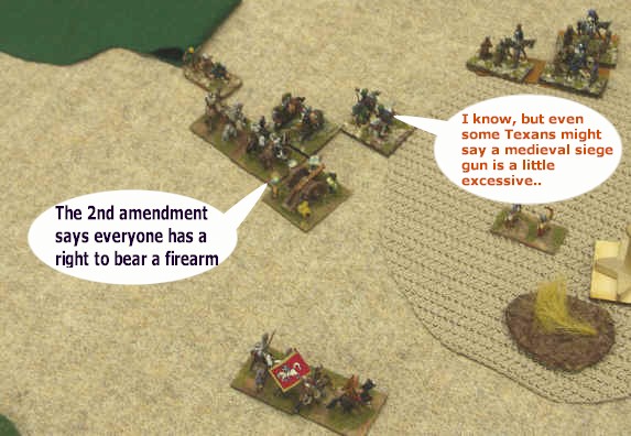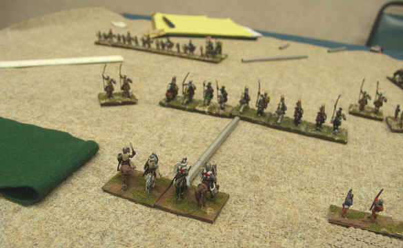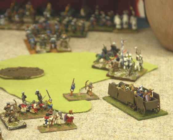 The Arabs were set up with lots of bowmen, who can find themselves as a target against large parts of my army, but they were initially well to the back. We had also both deployed our main strike forces asymmetrically, with most of my punch on my right, and the balance of Dans forces on my (refused) left, where the presence of the Artillery (S) had come as a nasty surprise (obviously he had not been reading this site carefully enough...)