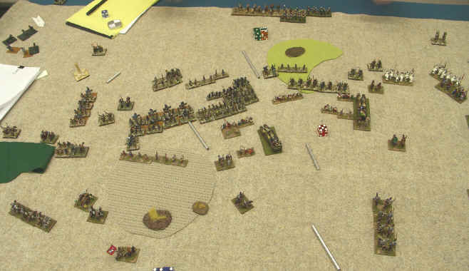 With both sides hunting elusive elements, me to win the game, Dan to take down my CinC's command, even the Teutons were sucked into the relatively undignified sport of hunting psiloi in rough going - and if you look carefully in the distance you will be able to make out a Teutonic Touchdown as one of the Brethren hammers some hordes on the Arab baseline.