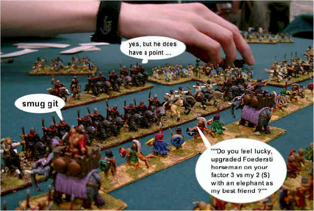 After a lot of shuffling, and with the auxila mostly out of the game as pips were thrown at the LH to save them from the wall of death approaching, the Romans were finally there with close to the best match-ups possible... Kn (F) vs Ps (S), and LH vs Elephants - with warband ready to mug anyone who dared to get through this rather surprisingly intimidating front line. Erm... what now ......?