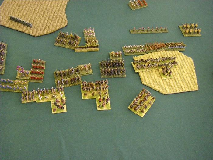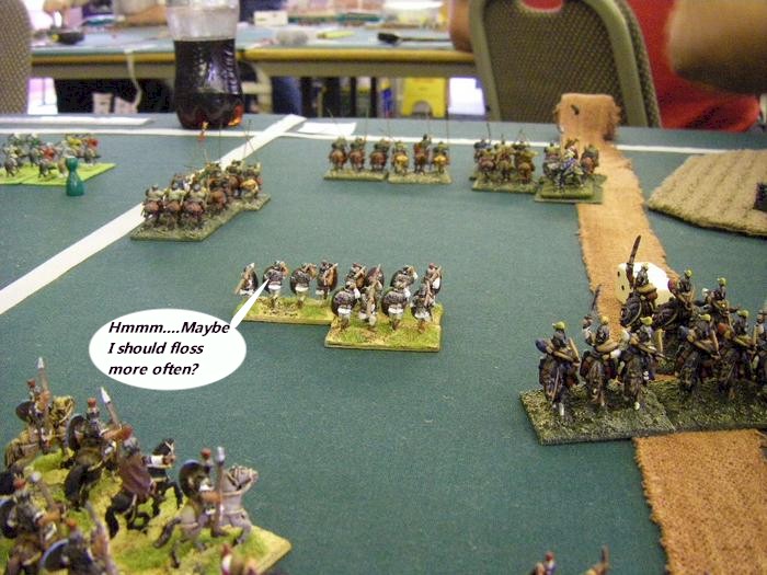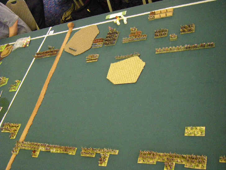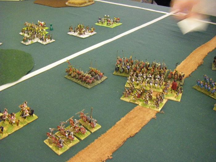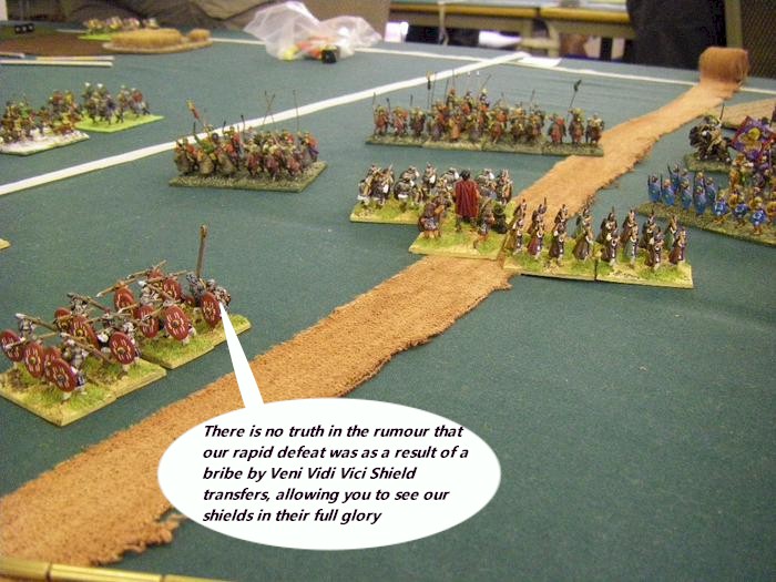 The astonishing Foederate Roman army was even bigger than mine, with loads of small blocks of cavalry, bizarrely a lot of it unarmored. Protected auxilia and cataphracts massed in the middle, and a line of skirmishing light horse on my right completed the set. With a largely bald table, I struggled to spread m army across the board. Yet again a Civil War looked set to start.