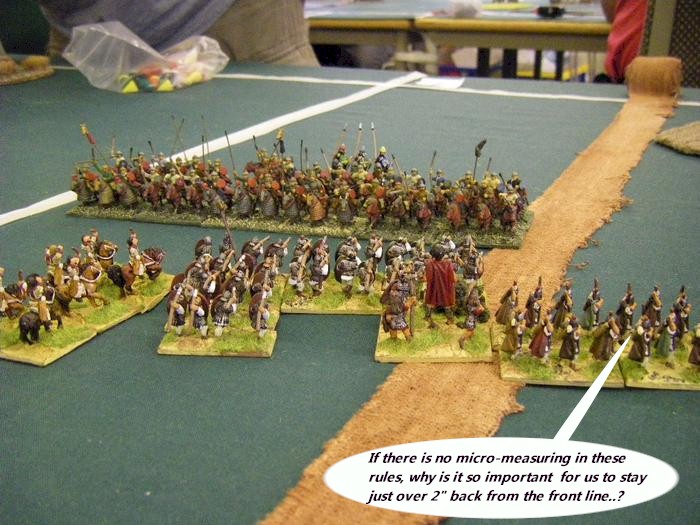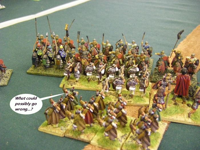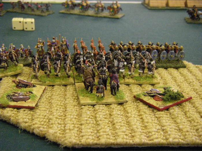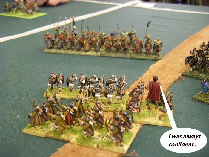 I suspect the Foederate Romans were optimized for facing off a much smaller, or much more Light-horse heavy opponent than us, with our wall-to-wall armoured infantry, and so they did find it difficult to punch a way through our wall of steel.