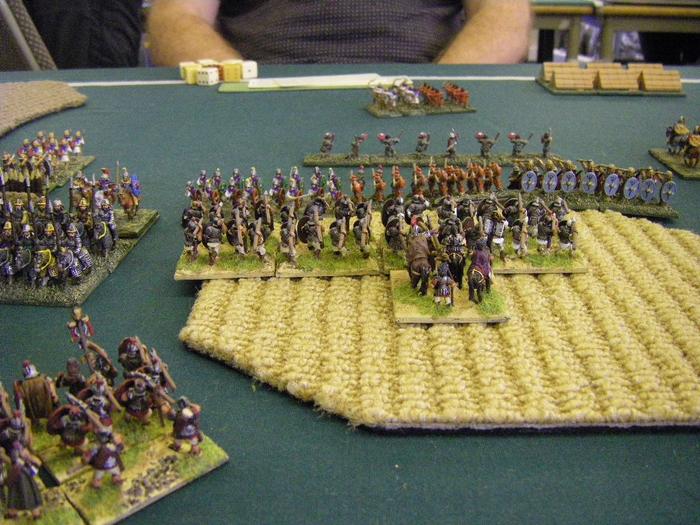 On my right both sides were trying to avoid combat, with first the Foederate Roman cavalry moving across to the left, swiftly followed by my legions, leaving some auxilia and legionaries to contest the field from enemy LH. My auxilia were off and running to try and bottle the enemy up before they could even get into the Rough Going of a ploughed field in the middle.