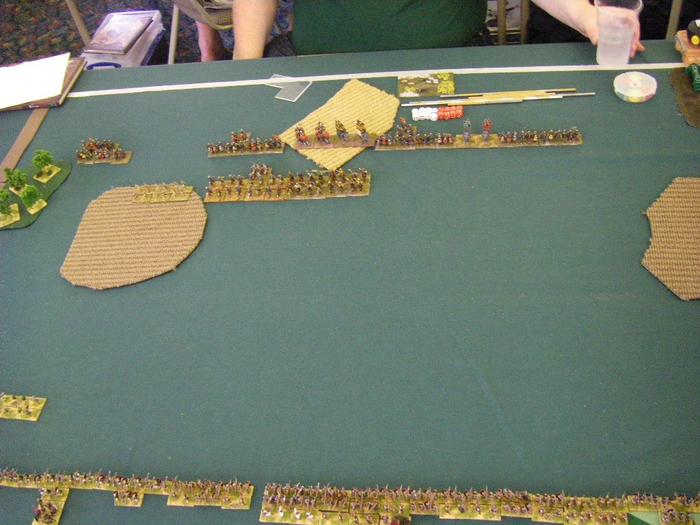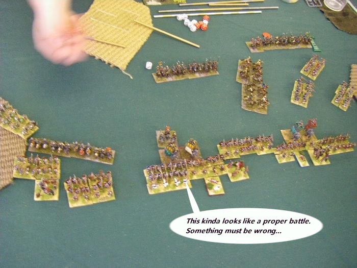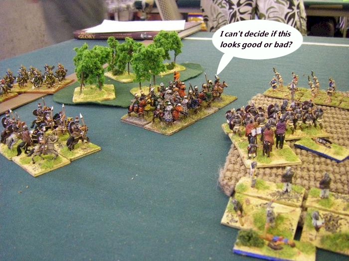 The terrain was also a bit of a bonus - fortunately the Sassanid general hadn't spotted the possibility to take a river and a road and remove large chunks of terrain from the edges of the table or we would have had significantly less scope to narrow the field and try and deal with his greater potential maneuverability.