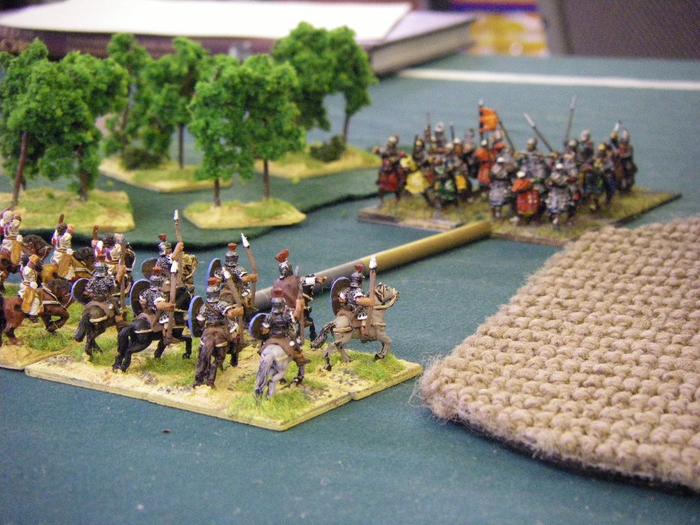Right on the other edge of the table, the Sassanid Clibanarii had failed to force a passage through the gap between the wood and a field, and were now reliant on their lighter colleagues on horseback and with slings to prevent them being caught in a trap, from which they can't escape...