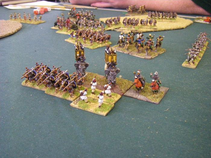 There appeared to be serious fisticuffs going on across the entire width of the table - but a closer look showed that the Sassanid Calibarii had in general turned tail and either evaded or fled, leaving pretty much just the Elephant Corps to continue to uphold the honour of Azhura Mazdahurahurahuru (I think its their god?). But the Smellies were doing the business, and had fragmented and disrupted some of their opponents..