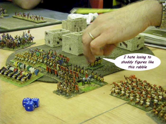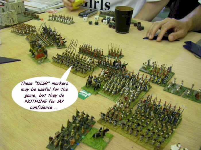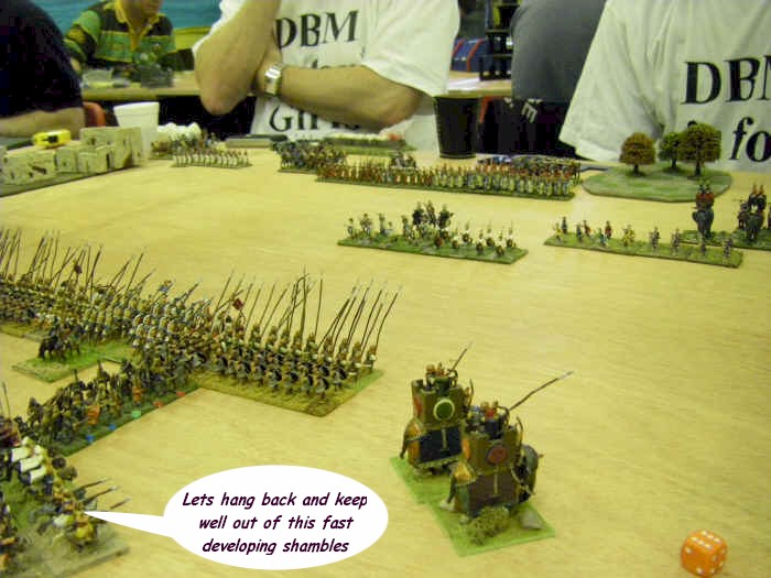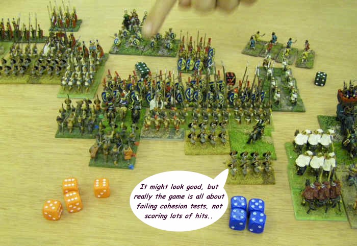 Meanwhile, in the middle, "Plan A, Subsection 1.1 - Your Center" was being executed to near perfection, as the Phalanx advanced. The only fly in the ointment came from the cheating Roman dogs, who had unsportingly brought some skirmishers along. This caused the Phalanx to charge repeatedly, as Dave's normal response to skirmishers ("erm, in 25mm people don;t bring as many skirmishers so it doesn't matter as much") proved surprisingly ineffective in this, the 15mm version of the game.