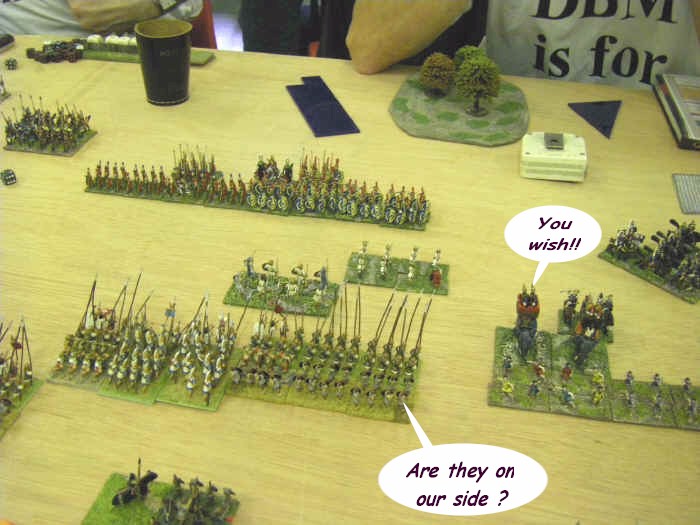 Our opponents were making a bold and deeply complex statement on the debilitating nature of the ongoing debate between DBM & FoG (other rulesets are available) for the Ancients hobby with their "DBM is for Girls" t-shirts. Apparently they appeared in them the next day as well, thus making an even more unmistakable statement on the tenuous links between personal hygiene and competition wargaming in towns with their own brewery.